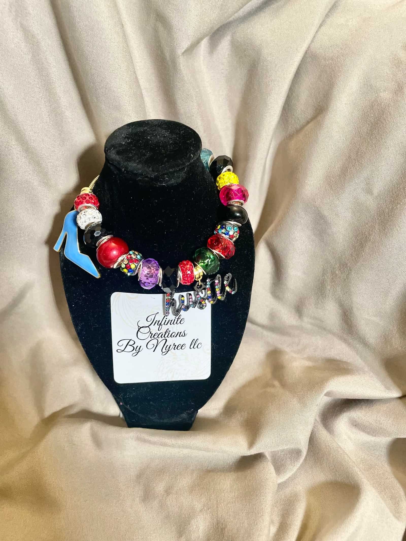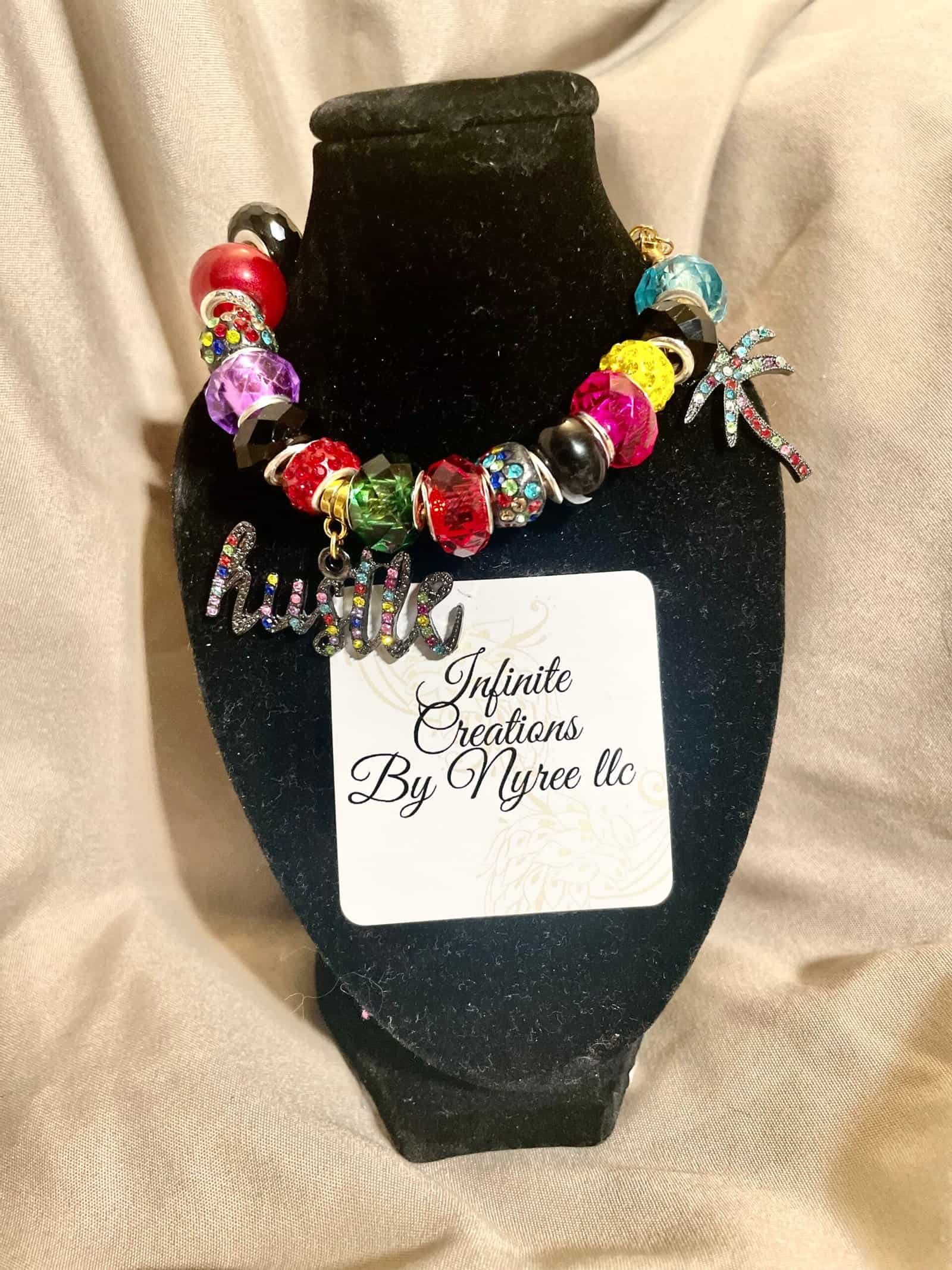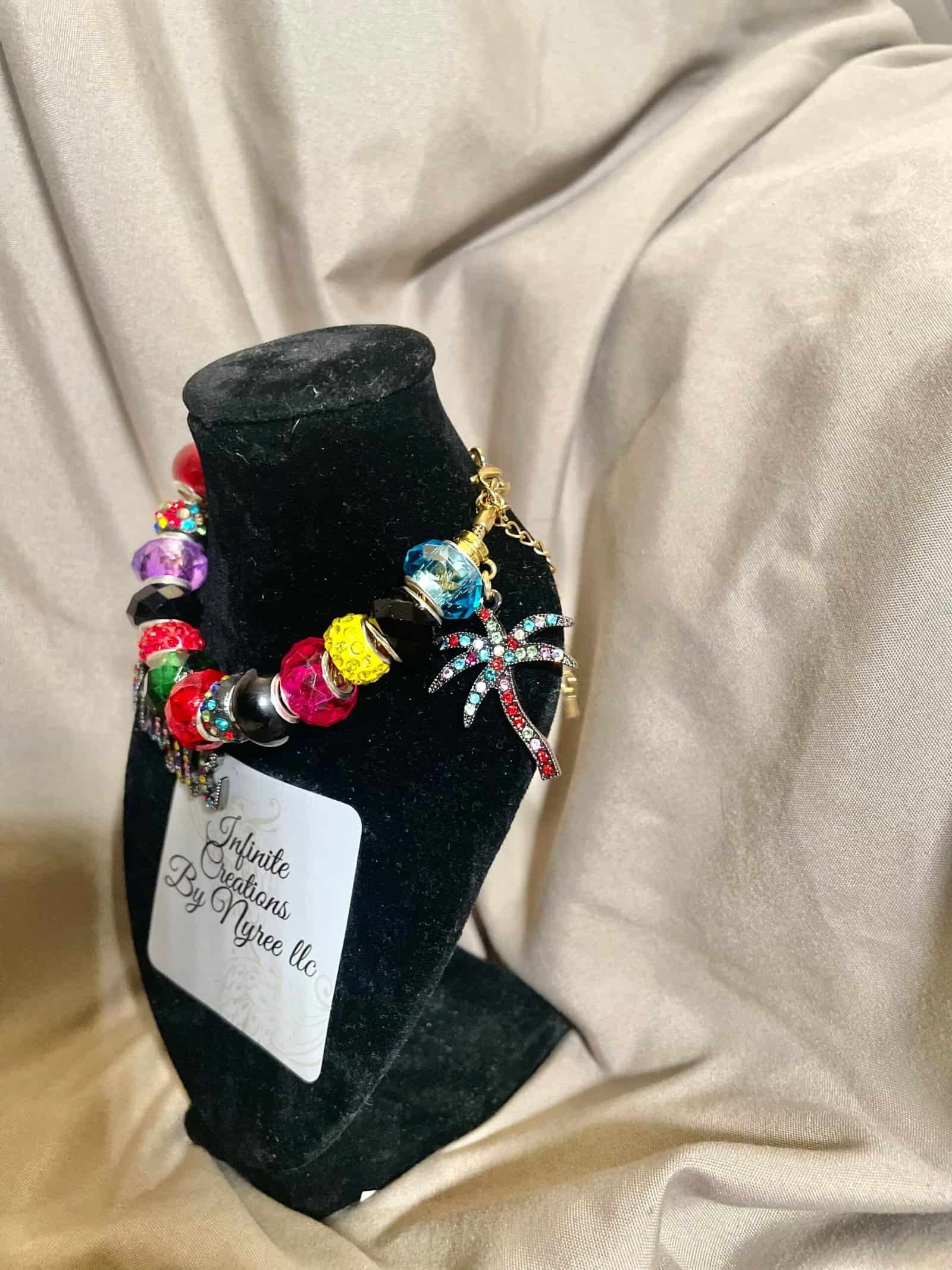 A dazzling mix of rhinestone- studded beads in every color of ambition- red, purple, green, yellow, blue, and black. With a glittery “hustle” charm and radiant palm tree, this bracelet celebrates bold dreams and tropical vibes.