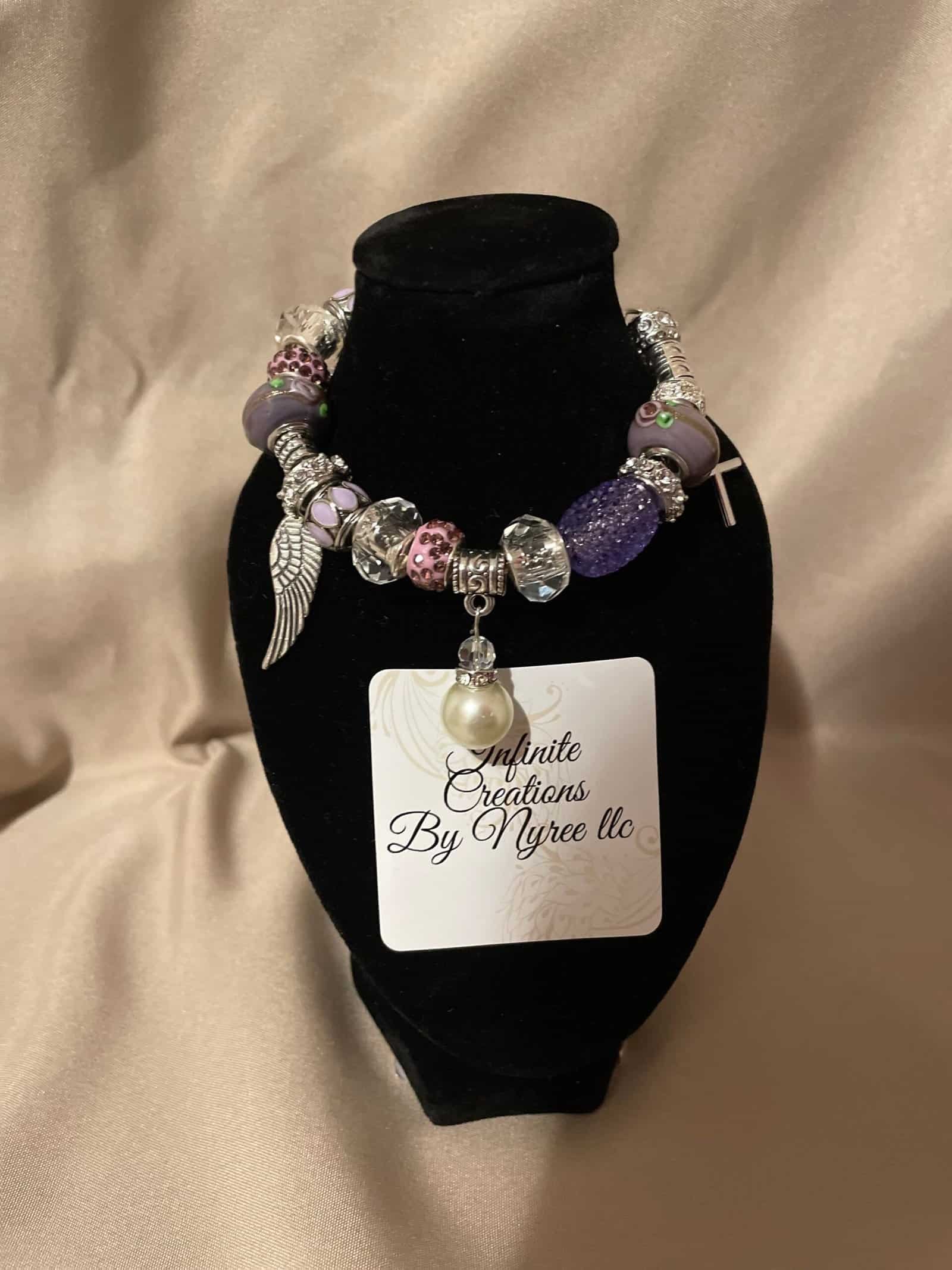 Elegant purple, pink and silver beads dance with texture and sparkle. A wing charm and pearl accent add softness and strength, making this bracelet a tribute to inner beauty, transformation, and grace.